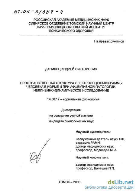 Данилец Андрей Викторович. Пространственная структура электроэнцефалограммы человека в норме и при аффективной патологии : Нелинейно-динамическое исследование : диссертация ... кандидата биологических наук : 14.00.17.- Томск, 2000.- 83 с.: ил. РГБ ОД, 61 02-3/667-4