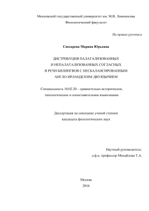 Целью диссертационной работы является исследование дистрибуции палатализованных и непалатализованных согласных3 на материале речи билингвов с ирландским языком как вторым на основе компьютерного анализа звучащей речи, а также сопоставление полученных данных с особенностями произношения информантов при использовании их первого языка. Компьютерный анализ позволяет обеспечить наиболее точное определение характеристик звуков и, следовательно, объективность выводов, в то время как обращение к материалу английского языка позволяет исследовать причины наблюдаемых явлений и делает работу интересной для более широкого круга исследователей.