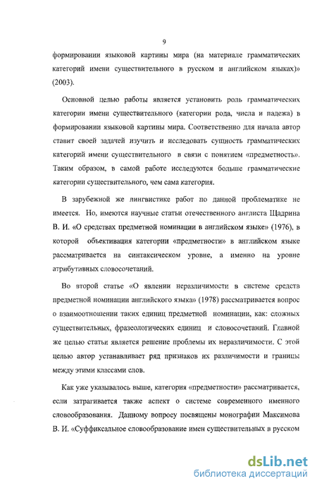 Автор представленной работы основное внимание уделяет синтетическим и аналитическим способам выражения категории предметности, вместе с тем сложный разнородный характер категории предметности еще недостаточно освещен в лингвистической литературе.
