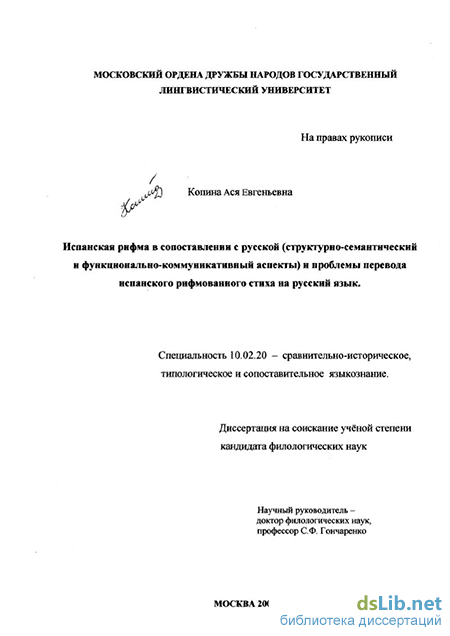 Копина Ася Евгеньевна. Испанская рифма в сопоставлении с русской (структурно-семантический и функционально-коммуникативный аспекты) и проблемы перевода испанского рифмованного стиха на русский язык : диссертация ... кандидата филологических наук : 10.02.20.- Москва, 2001.- 187 с.: ил. РГБ ОД, 61 01-10/706-6
