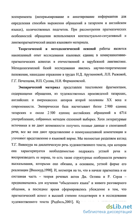 Эмпирический материал представлен текстовыми фрагментами, содержащими обращения, из художественных произведений татарских, английских и американских авторов второй половины XX века и современности. Эмпирическая база насчитывает более 2 900 единиц татарских и около 2 500 единиц английских обращений в 6714 употреблениях, собранных методом сплошной выборки. Хотя литературные источники и не дают возможности получить полные данные о спонтанной речи, все же они дают представление о коммуникативной компетенции и уточняют представление о языковой норме. Мы полностью разделяем взгляд Т.Г. Винокура на диалогическую речь художественного текста, при котором она характеризуется необходимостью подражать устной речи и воспроизводить ее нормы, то есть такие структурные особенности речевого высказывания, которыми оно обязано, в основном, устной форме его реализации [Винокур, 1990]. И, несмотря на то, что в начале прагматика и ее составная часть - теория речевых актов Дж. Остина и Р. Серля -предназначались для изучения "обыденного языка" и живого разговорного общения, в последнее время сформировалось убеждение в том, что прагматический аспект в высшей степени плодотворен и в исследовании художественного текста [Радбиль,2001]. Кроме того, в художественных