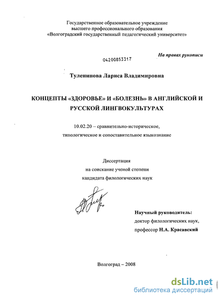 лингвокультурологии. Объектом исследования являются концепты «здоровье» и «болезнь» в английской и русской лингвокультурах. Предметом работы выступают культурно-специфические характеристики этих концептов в языковом сознании и коммуникативном поведении англичан и русских.