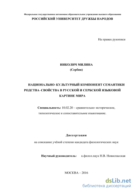 исследования малоизученного в области языкознания изменения и развития терминологии родства и свойства данных языков, и, во-вторых, сопоставлением функционирования лексических единиц кровного, духовного и свойственного родства в двух современных литературных славянских языках. Кроме того, актуальность обусловлена и важностью проведения сопоставительных лингвокультурологических исследований в целях определения места универсальных и специфичных элементов в сравниваемых русском и сербском языках.