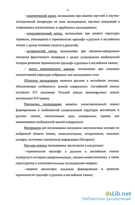 Предметом исследования является сопоставительный анализ формирования и особенностей семантической структуры английских и русских лексем, выполняющих роль специальных единиц для наименования особенностей земной поверхности.