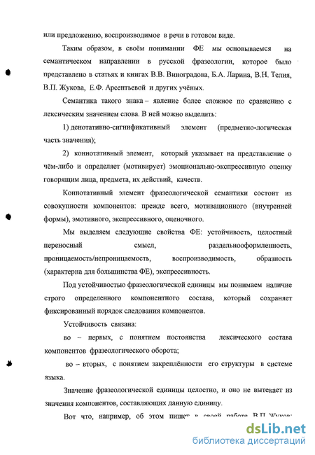 Таким образом, в своём понимании ФЕ мы основываемся на семантическом направлении в русской фразеологии, которое было представлено в статьях и книгах В.В. Виноградова, Б.А. Ларина, В.Н. Телия, В.П. Жукова, Е.Ф. Арсентьевой и других учёных.