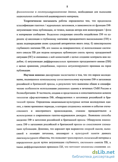 Научная новизна диссертации заключается в том, что это первое исследование, посвященное комплексному сопоставительному изучению ПФ в заголовках российской и британской прессы, в результате чего выявлены общие и специфические особенности использования указанных единиц в печатных СМИ России и Великобритании. В частности, создана и представлена в сопоставительном аспекте типология сфер-источников ПФ, обнаруженных в заголовках российской и британской прессы. Определены национально-культурные истоки исследуемых единиц, а также временные периоды, в которые создавались явления и события отечественного и иностранного происхождения, ставшие прецедентными и используемые в современном газетно-журнальном дискурсе.. Выявлены способы введения ПФ в заголовки российской и британской прессы. Обнаружена взаимосвязь ПФ в заголовках российской и британской прессы со смысловыми элементами публикации. Доказано, что адресант при выражении опорной мысли, выносимой в позицию заголовка, апеллирует к культурной памяти данного лингвокультурного общества, что позволяет транслировать излагаемый материал в определенном русле путем актуализации глубинного, системного смысла ПВ, а также дифференциальных признаков ПИ, что запускает механизмы сравнения, со- поставлення, переноса признаков и моделирования определенного восприятия материала, излагаемого в публикации.