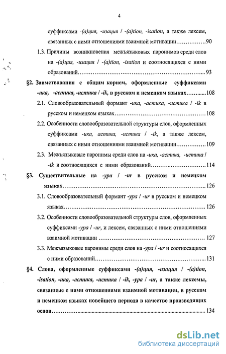 В третьей главе «Предпосылки развития межъязыковой паронимии на базе слов русского и немецкого языков, оформленных суффиксами -(а)ция, -изацш I -(a)tion, -isation; -ика, -астика, истика I -ik; -ура I -иг, а также лексем, связанных с ними отношениями взаимной мотивации» представлены словообразовательные ряды, образованные словами на -(а)ция, -изация I -(a)tion, -isation; -ика, -астика, истика I -ik; -ура I -иг, а также анализируется частотность и продуктивность словообразовательных моделей на базе данных лексем. Обращается внимание на различия в лексико-семантической ассимиляции близкозвучных лексем, например, разнонаправленная динамика развития лексического значения на почве языков-рецепторов, приобретение иноязычным образованием дополнительных коннотаций в одном из языков. На примере слов, оформленных суффиксами -(а)тор I -(a)tor и связанных отношениями взаимной мотивации со словами на -(а)ция, -изация I -(a)tion, -isation описывается словообразовательная модель, по которой образуются межъязыковые паронимы со сходными лексическими и грамматическими значениями. В главе анализируются расхождения в словообразовательной структуре однокорневых слов на -ика, -астика, -истика I -ik в русском и немецком языках. Как и во второй главе, изучается функционирование данной группы слов в качестве производящих основ, а также рассматриваются однокорневые прилагательные, которые соотносятся с указанными парными образованиями.