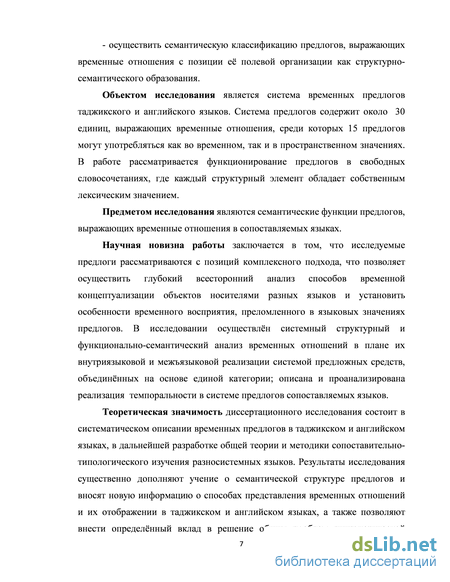 Объект исследования - системы временных предлогов таджикского и английского языков, (до 30 единиц) функционирующих в свободных словосочетаниях.