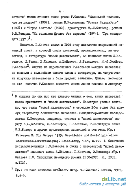 В.Стеженский в своей монографии о Л.Франке называет единственный признак литературы "новой деловитости" - "смакование эротических сцен" и ссылается на творчество Г.Кестена. (См.: Стежен-ский Б. Леонгард Франк ..., с.86). Другой исследователь -Г.Б.Гвазава - считает даже, что только "реакционные писатели придерживались стиля "новой вещности". (См.: Гвазава г.Б. Ганс Фаллада и его время ..., с.5).