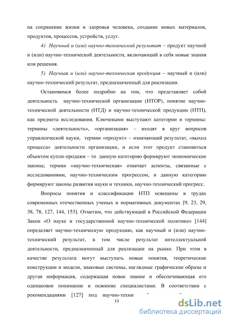 Вопросы понятия и классификации НТП освещены в трудах современных отечественных ученых и нормативных документах [9, 23, 29, 38, 78, 127, 144, 153]. Отметим, что действующий в Российской Федерации Закон «О науке и государственной научно-технической политике» [144] определяет научно-техническую продукцию, как научный и (или) научно-технический результат, в том числе результат интеллектуальной деятельности, предназначенный для реализации на рынке. При этом в качестве результата могут выступать новые понятия, теоретические конструкции и модели, знаковые системы, наглядные графические образы и другая информация, содержащая новое знание и обеспечивающая его одинаковое понимание и освоение специалистами. В соответствии с рекомендациями [127] под научно-технической продукцией принято понимать предназначенные для реализации результаты завершенных научно-исследовательских, опытно-конструкторских, проектных и технологических работ, а также услуги по их выполнению. К научно-технической продукции, прежде всего, относится техническая документация, опытные образцы, опытные партии, экспериментальные образцы, модели, макеты, отчеты о научно-исследовательской работе, а также отдельные виды работ, выполненных по заказу (испытания, подконтрольная эксплуатация, технологические операции и т.д.).