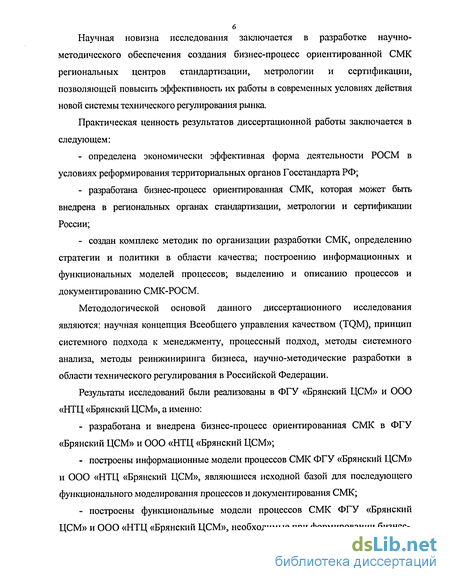 Научная новизна исследования заключается в разработке научно-методического обеспечения создания бизнес-процесс ориентированной СМК региональных центров стандартизации, метрологии и сертификации, позволяющей повысить эффективность их работы в современных условиях действия новой системы технического регулирования рынка.