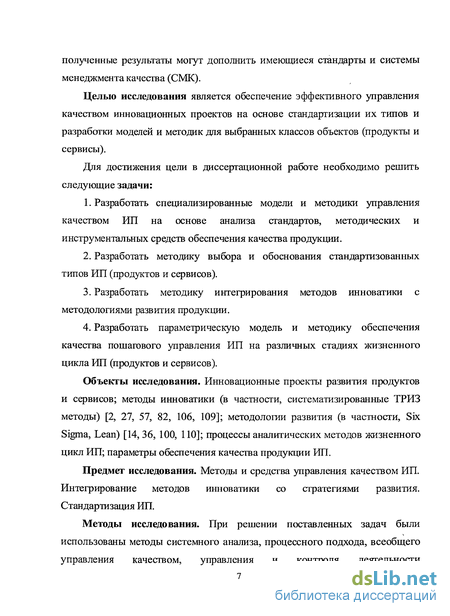Объекты исследования. Инновационные проекты развития продуктов и сервисов; методы инноватики (в частности, систематизированные ТРИЗ методы) [2, 27, 57, 82, 106, 109]; методологии развития (в частности, Six Sigma, Lean) [14, 36, 100, 110]; процессы аналитических методов жизненного цикл ИП; параметры обеспечения качества продукции ИП.