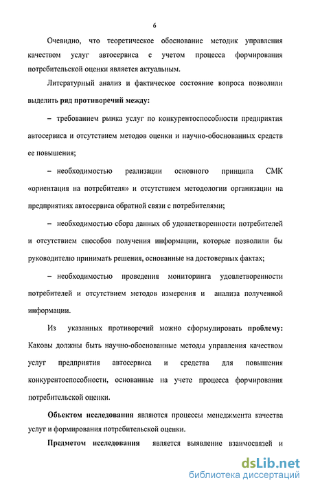 Целью работы является повышение конкурентоспособности предприятий автосервиса путем совместного управления процессами обеспечения качества услуг и протекающими одновременно с ними процессами формирования потребительской оценки.