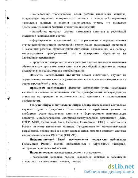 Цель и задачи исследования. Целью диссертации является рассмотрение широкого круга вопросов, связанных с исчислением и анализом показателя накопления капитала в СНС и формулирование предложений по совершенствованию методологической и информационной базы расчета накопления капитала в российской статистической практике.