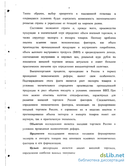 Основной задачей диссертации является определение экономических факторов, влияющих на объем экспорта и импорта товаров в период проведения экономических реформ в России.