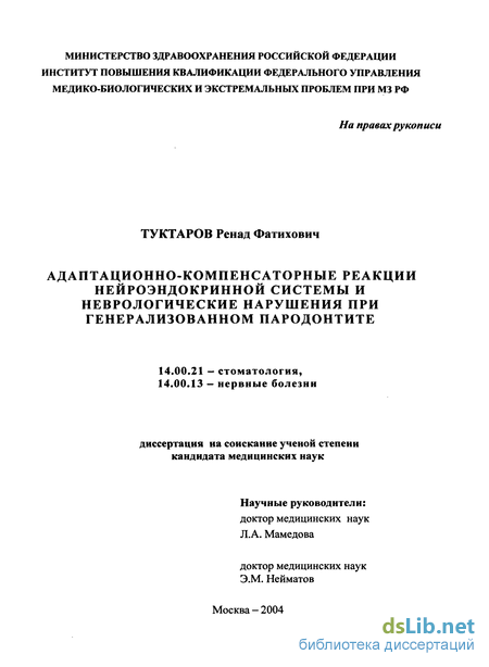 ГЛАВА 1 Адаптационно-компенсаторные реакции эндокринной системы и неврологические нарушения при генерализованном пародонтите (состояние вопроса по данным литературы) 9