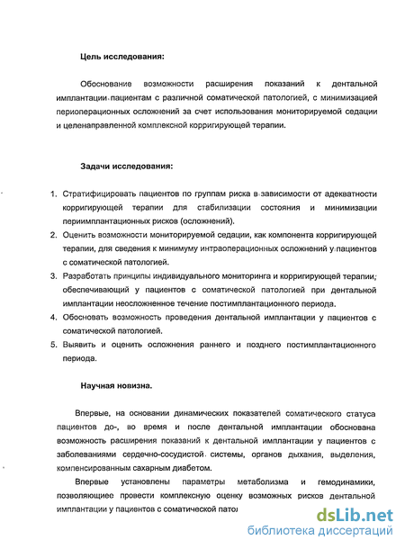 Целью этой главы явилось изучение возможности использования методики мониторируемои седации, как метода снижения интра- и послеоперационных рисков при дентальной имплантации у больных с сопутствующей патологией, а также изучение возможности расширения объема хирургической помощи, проводимого одномоментно в амбулаторных условиях.