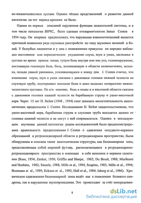 Одним из первых описаний нарушения функции жевательной системы, и в том числе патологии ВНЧС, было сделано отоларингологом James Costen в 1934 году. Он впервые предположил, что нарушение взаимоотношений является причиной появления ряда слуховых расстройств по типу шумовых явлений и болей. У беззубых пациентов и у лиц с пониженным прикусом он нередко наблюдал постоянное или периодическое ухудшение слуха, шум в ушах, щелканье в суставе во время приема пищи, тупую боль внутри или вне уха, головокружение, постоянную головную боль, боль, возникающую в области позвоночника, затылка, позади ушной раковины, усиливающуюся к концу дня. J. Costen считал, что изменение слуха, шум в ушах связаны с давлением головки нижней челюсти на слуховую трубу, подчеркивал значение боли и даже выделял «невралгию нижнечелюстного сустава». По его мнению, боль в языке и в височной области связана с давлением головки нижней челюсти на барабанную струну и ушно-височный нерв. Через 15 лет Н. Sicher (1948 , 1954) смог доказать несостоятельность анатомических предпосылок J. Costen. Исследования Н. Sicher свидетельствовали, что ушно-височный нерв, барабанная струна и слуховая труба находятся далеко от головки нижней челюсти и не могут с ней соприкасаться. Однако в последующем изучении данной патологии рядом исследователей была продемонстрирована правильность предположения J. Costen о сдавлении сосудисто-нервных образований в ретрокондилярной области и ретродискарном пространстве, были обнаружены и описаны такие анатомические структуры, как биламинарная зона, представляющая собой жировой футляр, располагающаяся в ретродискарном-ретрокондилярном пространстве и имеющая в себе венозное и нервное сплетения (Rees, 1954; Zenker, 1956; Griffin and Sharpe, 1962; Du Braul, 1988; Murikami and Hoshino, 1982; Smeele, 1988; Mills et al., 1994, Scapino, 1983; Mills et al., 1994; Boomann et al., 1999; Erikson et al, 1992; Hall et al, 1984; Isberg et al., 1986). Хроническое сдавливание биламинарной зоны ведёт как к появлению болевого синдрома, так и нарушению звукопроведения. Это происходит за счёт опосредован ного сдавления передней стенки наружнего слухового прохода головкой нижней челюсти после того, как происходят склеротические изменения и компенсаторная способность «биологического амортизатора» теряется.