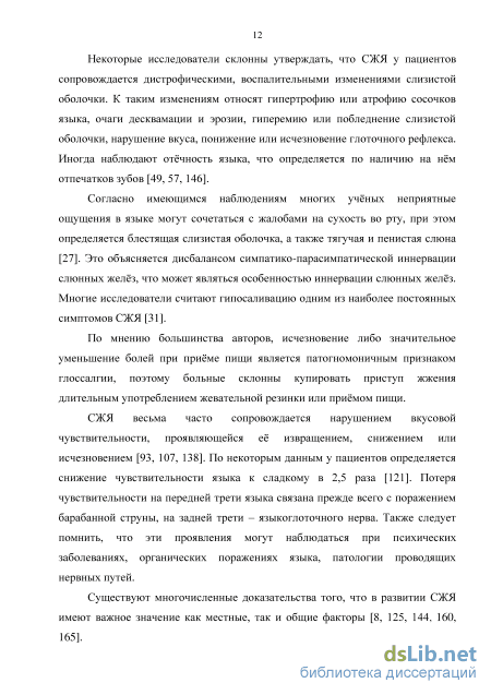 СЖЯ весьма часто сопровождается нарушением вкусовой чувствительности, проявляющейся её извращением, снижением или исчезновением [93, 107, 138]. По некоторым данным у пациентов определяется снижение чувствительности языка к сладкому в 2,5 раза [121]. Потеря чувствительности на передней трети языка связана прежде всего с поражением барабанной струны, на задней трети - языкоглоточного нерва. Также следует помнить, что эти проявления могут наблюдаться при психических заболеваниях, органических поражениях языка, патологии проводящих нервных путей.
