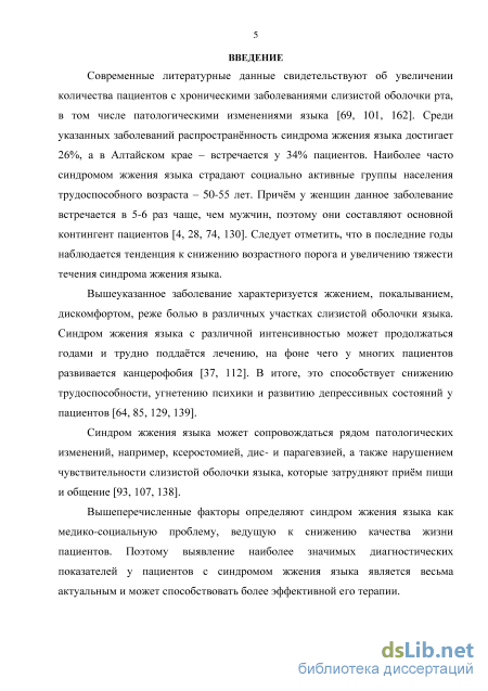 Современные литературные данные свидетельствуют об увеличении количества пациентов с хроническими заболеваниями слизистой оболочки рта, в том числе патологическими изменениями языка [Мороз Б.Т., 2003; Скуридин П.И., 2010; Terai, Н. 2005]. Среди указанных заболеваний распространённость синдрома жжения языка достигает 26%, а в Алтайском крае - 34%. Наиболее часто данное заболевание встречается среди социально активных групп населения трудоспособного возраста— 50-55 лет, особенно у женщин. Следует отметить, что в последние годы наблюдается тенденция к снижению возрастного порога и увеличению степени тяжести синдрома жжения языка у пациентов [Харитонова М.П., Ронь Г.И., 2000; Золотарёв А.С., 2011].
