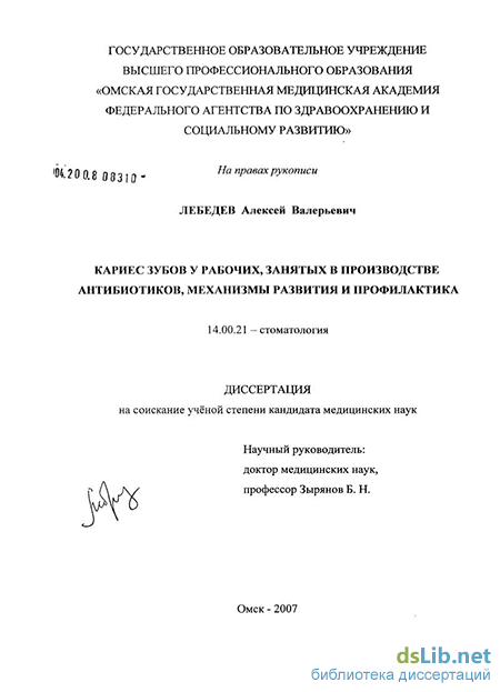 Изучение эпидемиологии, клиники и патогенеза кариеса зубов, разработка новых способов первичной патогенетической профилактики этого заболевания у рабочих производства антибиотиков на комбинате ОАО «Синтез» г Кургана явились моделью для экстраполяции данных на другие предприятия производства антибиотиков с учетом региональных особенностей