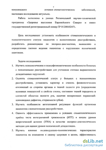 Цель исследования: установить особенности стоматологического и психологического статуса пациентов с психогенными расстройствами, разработать рекомендации по экспресс-диагностике, выяплению и определеншо тактики ведения пациентов с нарушением психической адаптации.