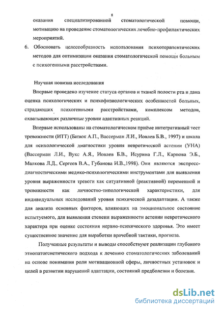 Изучить влияние индивидуально-психологических характеристик пациентов на отношение к- своему здоровью в целом, эффективность оказания специализированной стоматологической помощи, мотивацию на проведение стоматологических лечебно-профилактических мероприятий. 6. Обосновать целесообразность использования психотерапевтически* методов для оптимизации оказания стоматологической помощи больным с психогенными расстройствами.