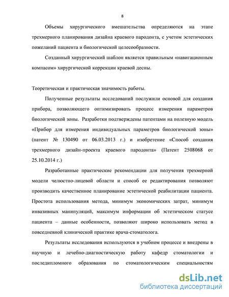 После получения 3 D модели необходимо открыть файл в программе Autodesk 3ds MAX и, нанести разметку параметров биологической зоны индивидуума из таблицы параметров. При этом необходимо учитывать искажение изображения, измеряя расстояние между заданными нами точками. И руководствуясь принципами существования биологической ширины, эстетическими требованиями пациента, правилом Tarnow и биологической целесообразностью создаем варианты дизайн проектов краевого пародонта и твердых тканей зубов. Исходя из объемов изменения краевого пародонта и размера биологической зоны, нам становится понятно какой объем хирургических и ортопедических манипуляции необходим для реализации конкретного дизайн – проекта. Варианты проектов и объемы манипуляций для их осуществления демонстрируются пациенту, предаются на электронном носителе либо пересылаются на электронную почту для подробного изучения и выбора того или иного проекта. Варианты дизайн проектов, при установке соответствующего программного обеспечения, можно просматривать при помощи планшетного компьютера, смартфона. После утверждения начинается лабораторный и клинический этап реализации дизайн – проекта.