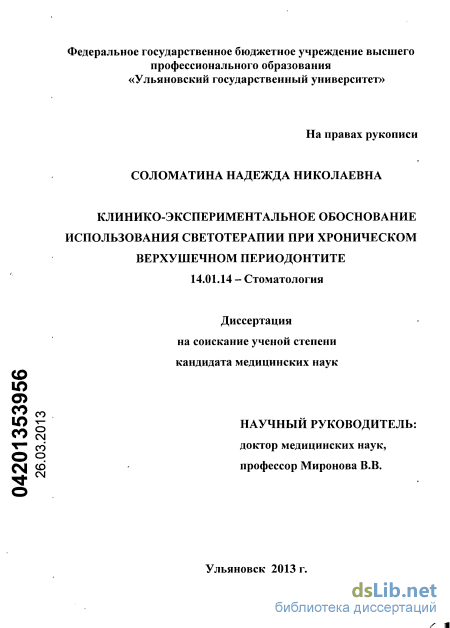 По результатам проведенного исследования издано учебно-методическое пособие «Диагностика и светолечение хронического верхушечного периодонтита» для стоматологов, студентов медицинского факультета, клинических интернов и ординаторов.