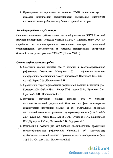 Клинические проявления гастроэзофагеальной рефлюксной болезни в полости рта.-Сборник трудов XXVI итоговой научной конференции молодых ученых МГМСУ.-М.-2004.-С.86. Поликанова Е.Н.