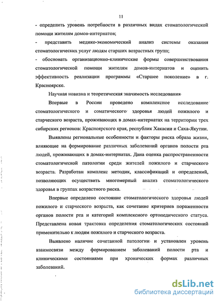Наиболее удобным и доступным объектом изучения проблем здоровья людей пожилого и старческого возраста является, их организованное проживание в домах пожилых, домах-интернатах, приютах, которые могут быть моделью для отработки новых форм оказания медицинских, в том числе и стоматологических услуг. Анализ доступной нам специальной литературы показал, что научных исследований с анализом «стоматологического здоровья» населения старших возрастных групп, проживающих в таких организованных коллективах, весьма недостаточно. Практически отсутствуют разработки по определению потребности пожилых людей в различных видах стоматологической помощи и медико-экономические обоснования организационных форм оказания стоматологических услуг.