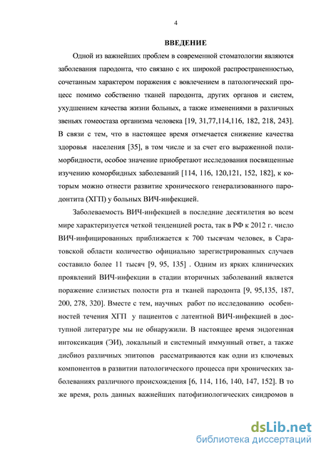 современной стоматологии являются заболевания пародонта, что связано с их широкой распространенностью; сочетанным характером поражения с вовлечением в патологический процесс, помимо собственно тканей пародонта, других органов и систем; ухудшением качества жизни больных, а также изменениями в различных звеньях гомеостаза организма человека [Булкина Н.В. и др., 2009; Дмитриева Л.А., Максимовский Ю.М., 2010; Максимовский Ю.М., Митронин А.В., 2011; Соболева Л.А. и др. 2011, 2012; Eke P. I. et al., 2012; Kazemi H.H., Mortazavi N. et al., 2013; Mahendra J. et al., 2013]. В связи с тем что в настоящее время отмечается снижение качества здоровья населения [Ершов Ф.И., 2006], в том числе и за счет его выраженной полиморбидности, особое значение приобретают исследования, посвященные изучению коморбидных заболеваний [Сорокина А.А., 2010; Соболева Л.А. и др. ,2011, 2012; Eke P. I. et al., 2012; Ambili R. et al., 2013], к которым можно отнести развитие хронического генерализованного пародонтита (ХГП) у больных ВИЧ-инфекцией.