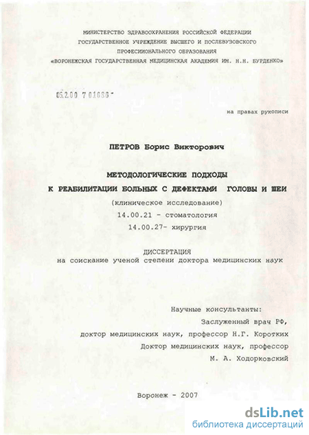 В связи с этим разработка комплексных методов реабилитации пациентов с дефектами головы и шеи, обеспечивающих благоприятный исход лечения и максимальное повышение качества жизни является назревшей и актуальной проблемой современной медицины.