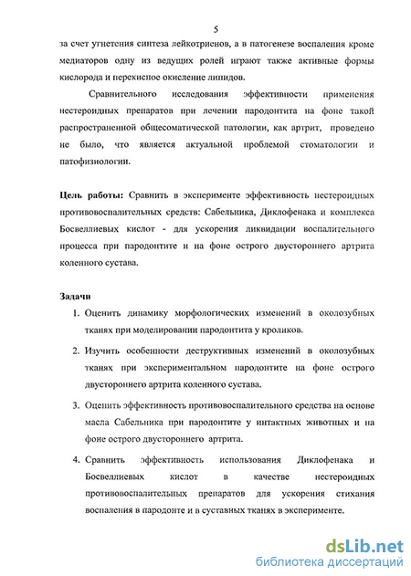 Цель работы Сравнить в эксперименте эффективность нестероидных противовоспалительных препаратов: Сабельника, Диклофенака и комплекса Босвеллиевых кислот - для ускорения ликвидации воспалительного процесса при пародонтите и на фоне острого двустороннего артрита.