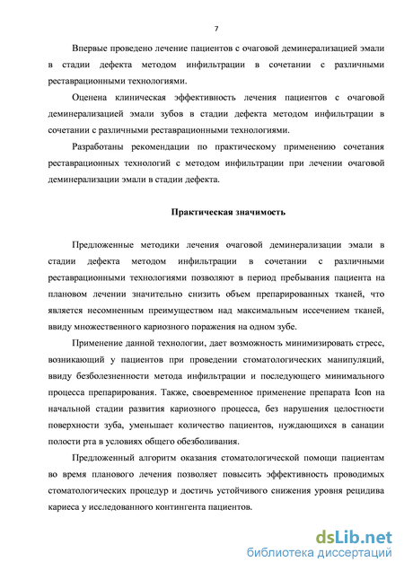 Исходя из проведенных лабораторных и клинических исследований, доказана эффективность применения метода лечения очаговой деминерализации эмали в стадии дефекта методом инфильтрации в сочетании с различными реставрационными технологиями. В ходе лабораторного исследования для реставрации композиционным материалом светового отверждения EcuSphere Shine в сочетании с адгезивной системой 6 поколения на шлифах отмечается наличие пломбировочного материала в полости зуба. Но, несмотря на это, запломбированный дефект на всю толщину пронизан микротрещинами и наблюдается частичное отслоение пломбировочного материала от стенок полости. После испытания данной методики на пациентах, были получены удовлетворительные результаты сочетания этого материала с препаратом Icon. Визуально, отреставрированные дефекты зубов пациентов данной группы гладкие, без нарушения целостности поверхности, без видимых переходов пломбировочного материала в ткани зуба. Такое различие между двумя видами исследований возможно, ввиду отличия структуры удаленного зуба.