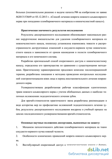 заявке №2013153649 от 03.12.2013 г. «Способ лечения неврита нижнего альвеолярного нерва при попадании пломбировочного материала в нижнечелюстной канал»).