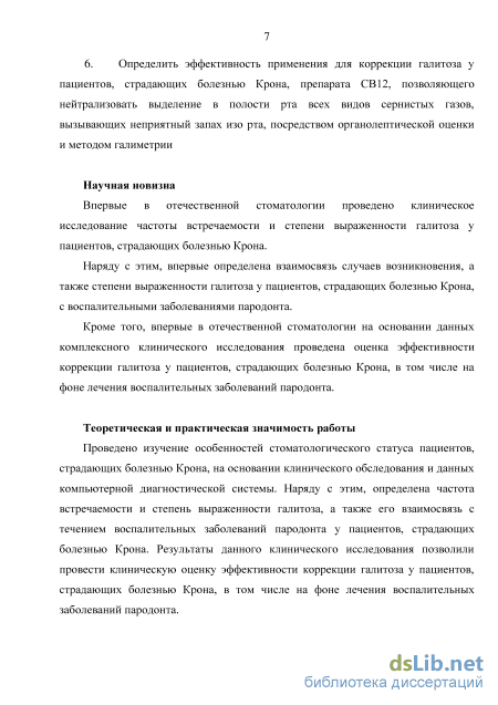 Научная новизна. Впервые в отечественной стоматологии проведено клиническое исследование частоты встречаемости и степени выраженности галитоза у пациентов, страдающих болезнью Крона. Наряду с этим, впервые определена взаимосвязь случаев возникновения, а также степени выраженности галитоза у пациентов, страдающих болезнью Крона, с воспалительными заболеваниями пародонта. Кроме того, впервые в отечественной стоматологии на основании данных комплексного клинического исследования проведена оценка эффективности коррекции галитоза у пациентов, страдающих болезнью Крона, в том числе на фоне лечения воспалительных заболеваний пародонта.