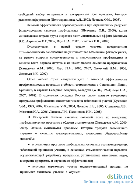 Существующая в нашей стране система профилактики стоматологических заболеваний не учитывает все возможные факторы риска, не решает вопросы преемственности и непрерывности профилактики в течение всего периода детства и не имеет модели семейной профилактики (Хамадеева A.M., 2000; Леус П.А., 2006, 2007; Яновский Л.М., 2006; Леонтьев В.К., 2007).