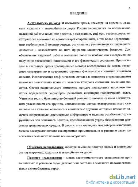 Актуальность работы. В настоящее время, несмотря на проводимые на сети железных и автомобильных дорог России мероприятия по обеспечению надежной работы земляного полотна, к сожалению, ещё есть участки дорог, на которых его состояние не соответствует современным, а тем более перспективным требованиям. В первую очередь, это связано с увеличением интенсивности движения и воздействием на него природно-климатических факторов. Для обеспечения надежной работы земляного полотна необходимо своевременное получение достоверной информации о его фактическом состоянии. Применяемые в настоящее время традиционные методы обследования не всегда позволяют своевременно и качественно оценить фактическое состояние земляного полотна. Использование геофизических методов в комплексе с традиционными позволяет значительно повысить качество контроля состояния земляного полотна. Состав рационального комплекса методов диагностики земляного полотна определяется характером решаемых инженерно-геологических задач. Учитывая то, что большинство болезней земляного полотна связано с избыточным увлажнением его грунтов, использование метода электромагнитного сканирования в качестве основного в комплексе с другими методами позволит получать непрерывную, достоверную информацию о наличии ослабленных деструктивных зон земляного полотна, представляющих угрозу безопасности движения транспортных средств. В связи с этим очевидно, что задача совершенствования метода электромагнитного сканирования применительно к решению задач диагностики земляного полотна является весьма актуальной.