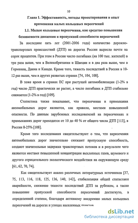 В первой главе приведен обзор и анализ нормативно-методической научно-исследовательской литературы, рассматривающей вопросы, связанные с проектированием и эксплуатацией кольцевых пересечений, как в нашей стране, так и за рубежом для повышения безопасности движения и пропускной способности на пересечениях в одном уровне. Рассматриваются методы расчета пропускной способности кольцевых пересечений в различных странах. Проанализирован отечественный и зарубежный опыт применения малых кольцевых пересечений на автомобильных дорогах в населенных пунктах. Приводится статистика дорожно-транспортных происшествий до и после устройства малых кольцевых пересечений в других странах. Формулируется цель и задачи исследования.