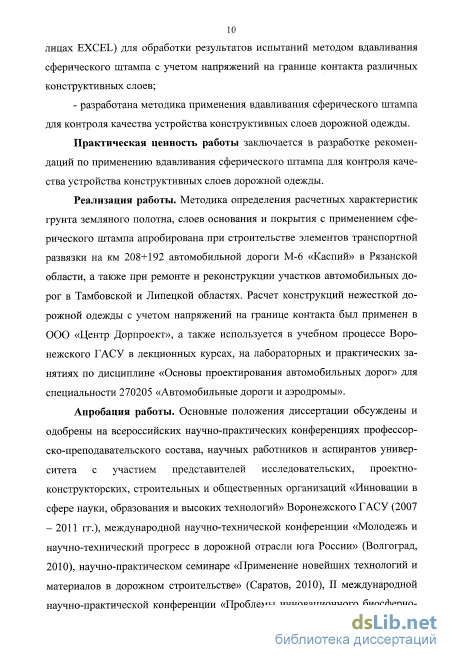 Реализация работы. Методика определения расчетных характеристик грунта земляного полотна, слоев основания и покрытия с применением сферического штампа апробирована при строительстве элементов транспортной развязки на км 208+192 автомобильной дороги М-6 «Каспий» в Рязанской области, а также при ремонте и реконструкции участков автомобильных дорог в Тамбовской и Липецкой областях. Расчет конструкций нежесткой дорожной одежды с учетом напряжений на границе контакта был применен в ООО «Центр Дорпроект», а также используется в учебном процессе Воронежского ГАСУ в лекционных курсах, на лабораторных и практических занятиях по дисциплине «Основы проектирования автомобильных дорог» для специальности 270205 «Автомобильные дороги и аэродромы».
