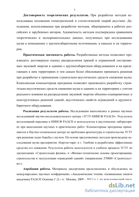 Достоверность теоретических результатов. При разработке методов использованы положения геометрической и статистической теорий акустики. Допущения, использованные при разработке методов, общеприняты в работах российских и зарубежных авторов. Адекватность методов подтверждена сравнением теоретических и экспериментальных данных, полученных при исследованиях шума в помещениях с крупногабаритными источниками, в каналах и на территории.