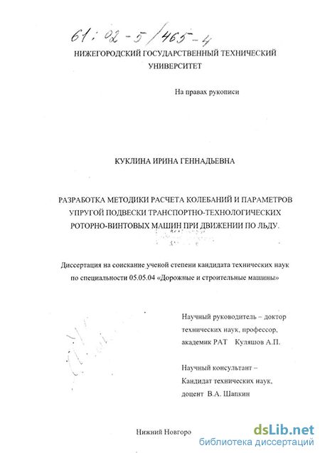 Куклина Ирина Геннадьевна. Разработка методики расчета колебаний и параметров упругой подвески транспортно-технологических роторно-винтовых машин при движении по льду : диссертация ... кандидата технических наук : 05.05.04.- Нижний Новгород, 2001.- 238 с.: ил. РГБ ОД, 61 02-5/465-4