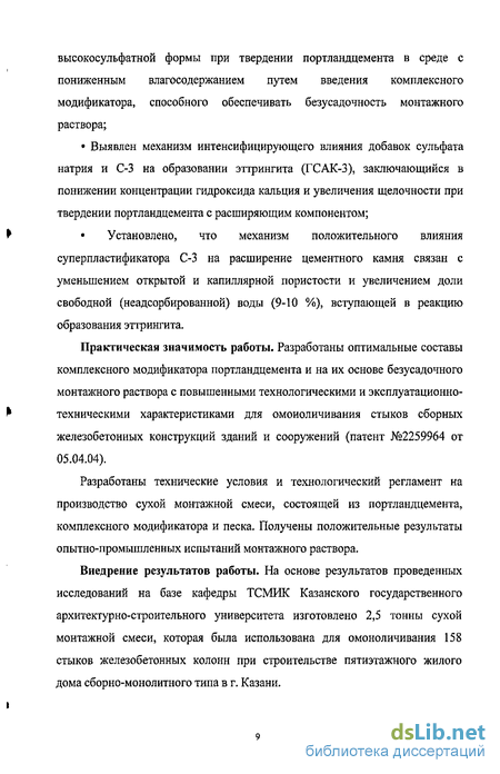 Практическая значимость работы. Разработаны оптимальные составы комплексного модификатора портландцемента и на их основе безусадочного монтажного раствора с повышенными технологическими и эксплуатационно-техническими характеристиками для омоноличивания стыков сборных железобетонных конструкций зданий и сооружений (патент №2259964 от 05.04.04).