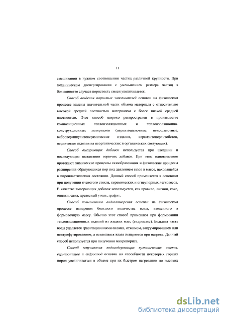 Высокопористое строение материала достигается обычно следующими технологическими способами: созданием волокнистого каркаса; газо- и пенообразованием; воздухововлечением; фракционным подбором составов (диспергированием); введением пористых заполнителей и выгорающих добавок; повышенным водозатворением; вспучиванием водосодержащих вулканических стекол, вермикулитов и гидрослюд; баротермальным, в том числе вспучиванием перлитов и глин в момент обжига в среде водяного пара со снижением давления; перекристаллизацией химических солей; нагревом гелей при высоких температурах; поризацией с одновременным армированием керамическими и огнеупорными волокнами [2].