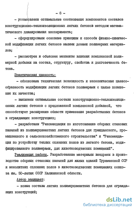 Реализация работы. Разработанные материалы внедрены в производстве сборных стеновых панелей для жилых зданий Туркменской ССЯР и монолитных сплошных полов в животноводческих помещениях совхоза им. 50-летия СССР Калининской области. Автор защищает:
