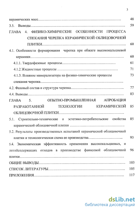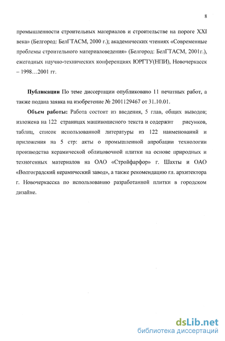 Объем работы: Работа состоит из введения, 5 глав, общих выводов; изложена на 122 страницах машинописного текста и содержит рисунков, таблиц, список использованной литературы из 122 наименований и приложения на 5 стр: акты о промышленной апробации технологии производства керамической облицовочной плитки на основе природных и техногенных материалов на ОАО «Стройфарфор» г. Шахты и ОАО «Волгоградский керамический завод», а также рекомендацию гл. архитектора г. Новочеркасска по использованию разработанной плитки в городском дизайне.
