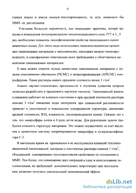 В Российской и мировой практике не применялся теплоизоляционный тампонажный материал с плотностью раствора меньше 1 T/CMJ , обладающий одновременно требуемыми растекаемостью, сроками схватывания, нерас-слаиваемостью, однородностью раствора, прочностью цементного камня. Применение таких составов решали бы двойную задачу: обеспечение герметичности затрубного пространства при заданной несущей способности горных пород и имели низкую теплопроводность, то есть защищали бы ММП от растепления.