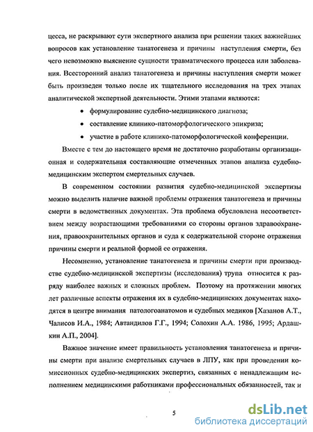 Установление танатогенеза и причины смерти при исследовании (экспертизе) трупа и их отражение в медицинской документации относится к наиболее важным и сложным проблемам, находящимся в центре внимания патологоанатомов и судебных медиков (Хаза-нов А. Т., Чалисов И. А., 1984; Автандилов Г. Г., 1994; Солохин А. А., 1986,1995; Ардашкин А. П., 2004).