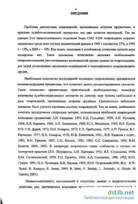 Немногочисленность исследований и отсутствие данных о морфологических свойствах ран, причиняемых колющими предметами конкретных конструкций, в значительной степени затрудняет решение многих вопросов при проведении судебно-медицинских экспертиз. К настоящему времени известны и представляют большой научно-практический интерес диссертационные работы ИГЛ Олейник (1987) и JLB, Шадыжевой(1993),